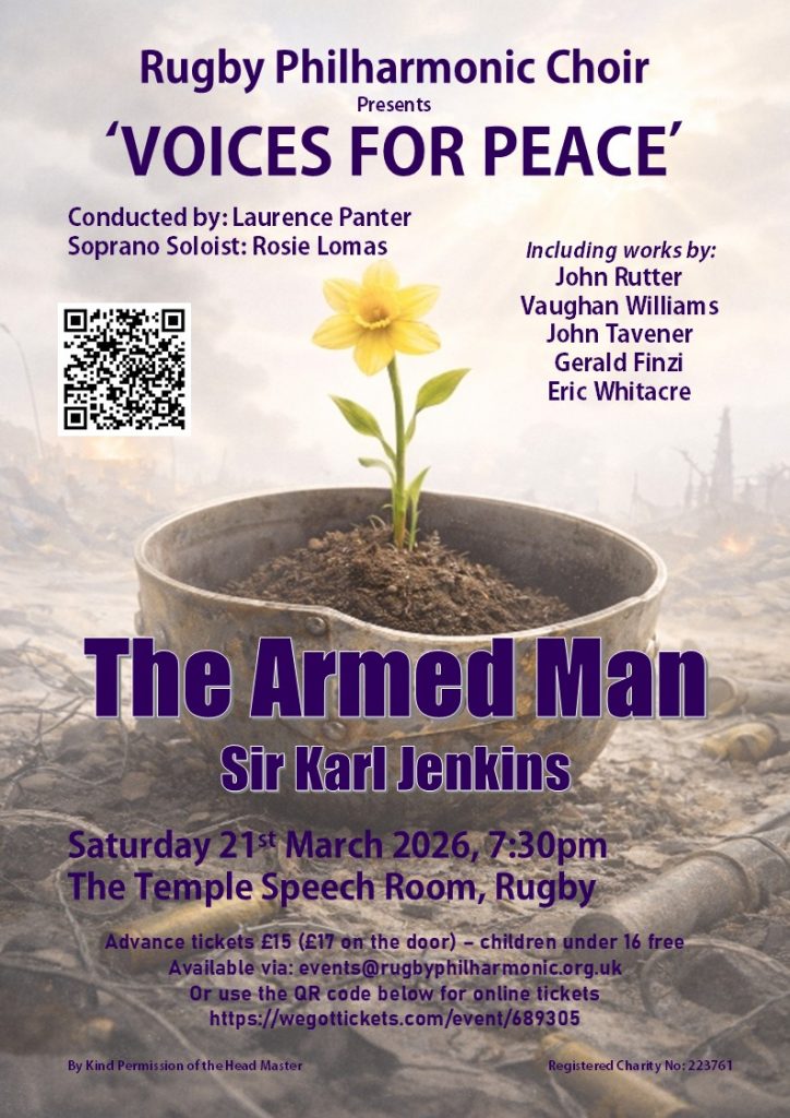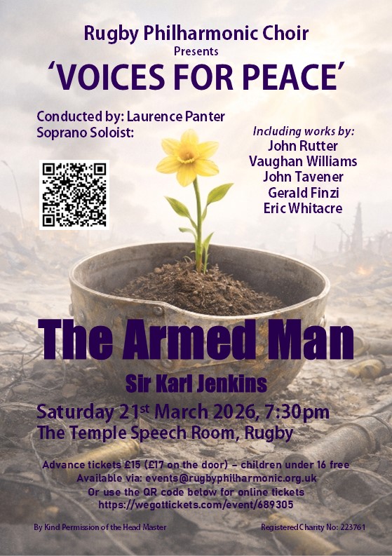 Rugby Philharmonic Choir together with The Rugby Philharmonic Sinfonia presents an unforgettable evening of powerful music and reflection on Saturday 21st March at 7:30pm in the beautiful Temple Speech Room, Rugby.